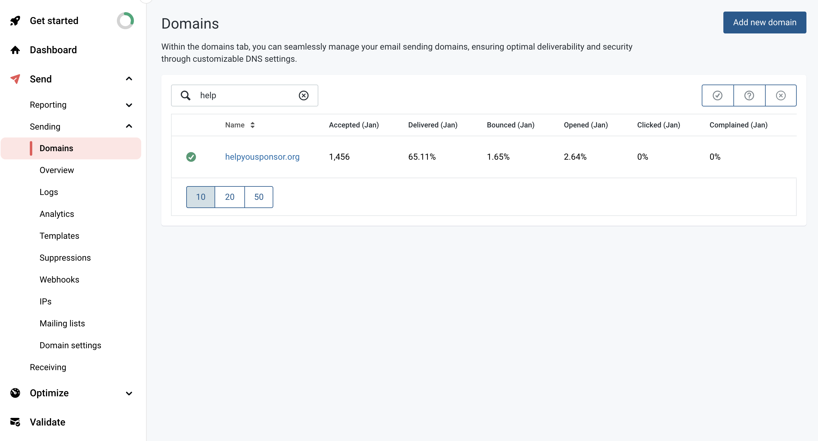 Once you have created your Mailgun account and logged in, click on "**Send**" on the side menu to expand and show more options then click on "**Sending**" and select "**Domains**". Click on the URL under the Name column in the domains table. Alternatively, if you do not have a custom domain set up, you can use the Mailgun Subdomains option.