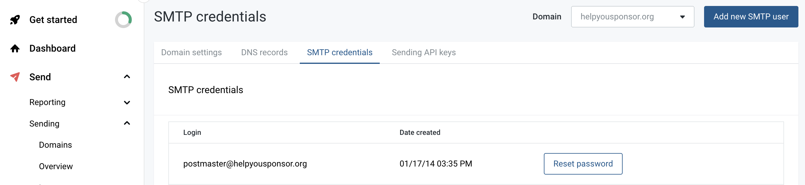 Once you click on the domain name, you’ll be redirected to a page displaying your domain Information. To get the SMTP credentials click on the SMTP credentials tab. If you do not remember the password, you can use the option of resetting the password.
