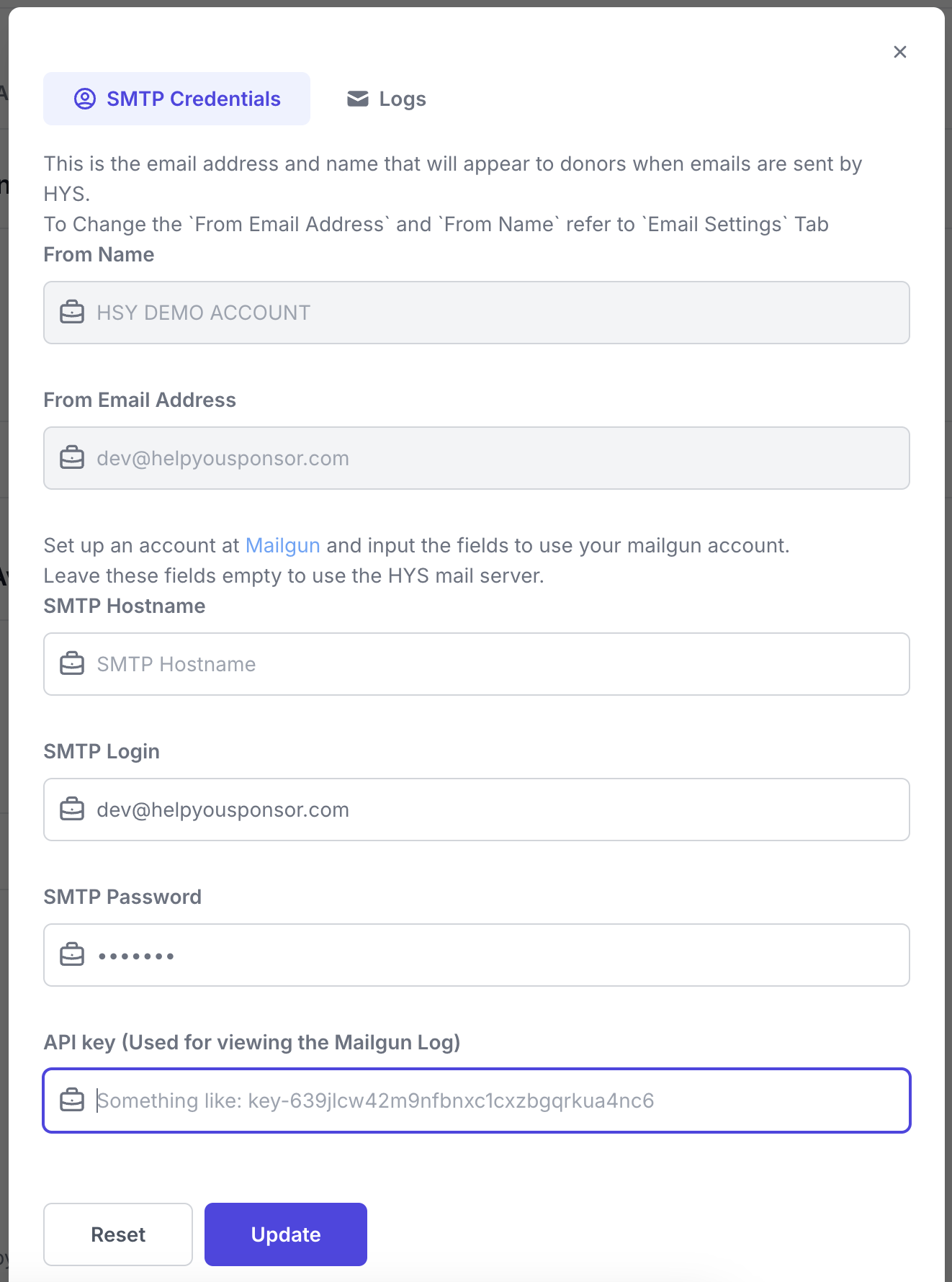Once you’ve filled in all the information, click **Update**. Now, HelpYouSponsor will send emails through your Mailgun account.