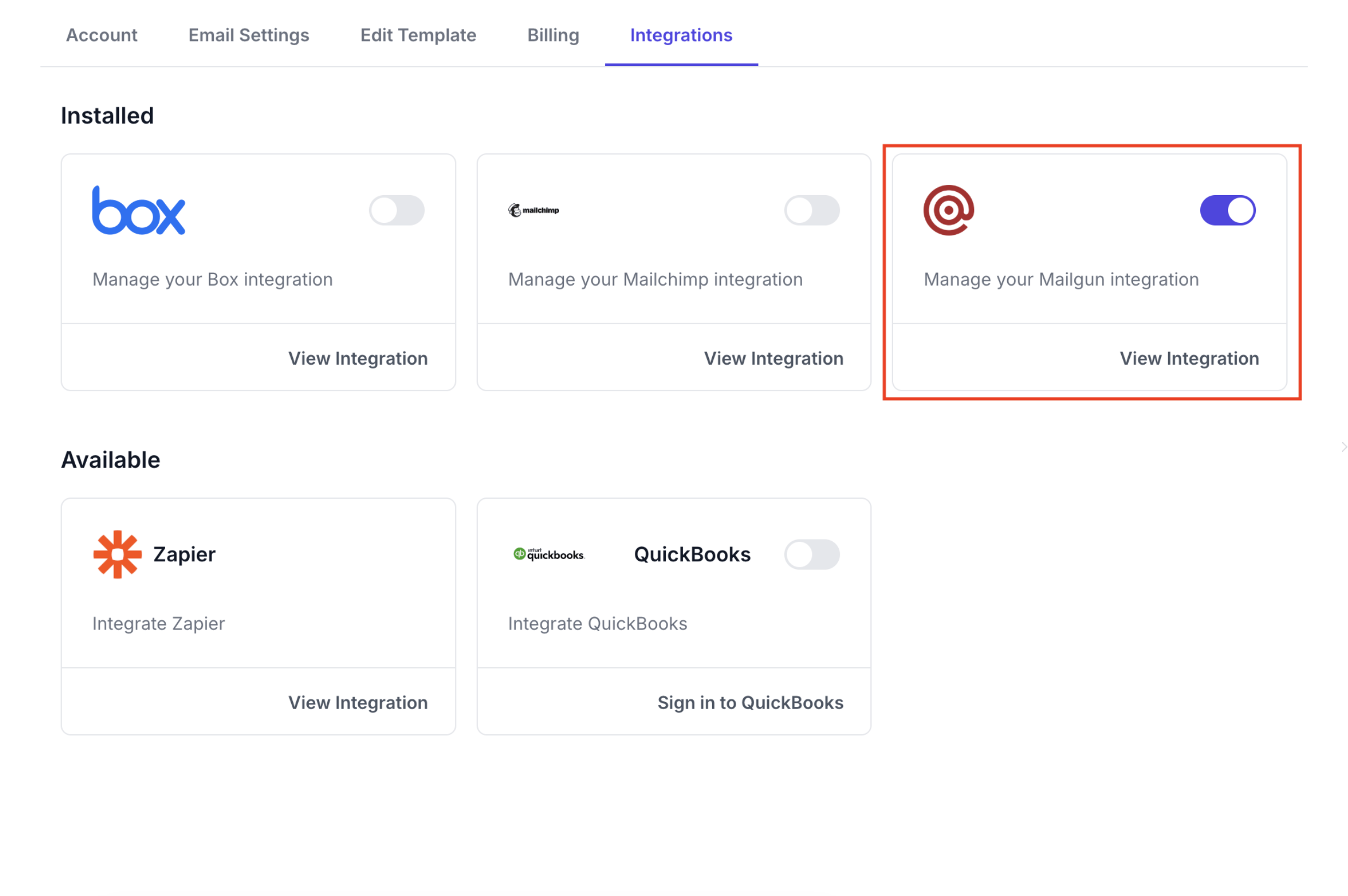 Click **"View integration"** on the Mailgun card shown in the red box above to fill in your Mailgun information.