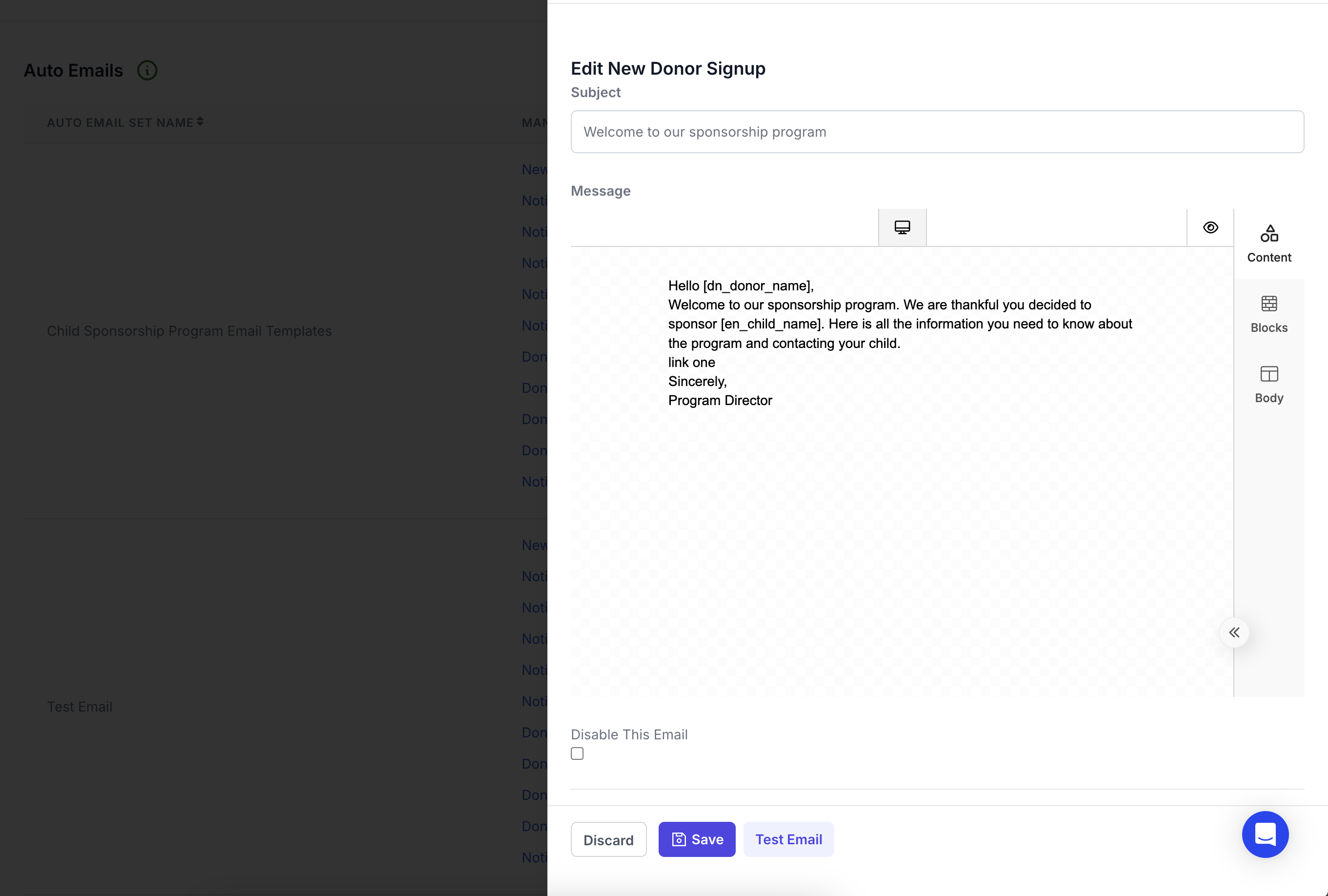 After creating an auto email set, you would wish to customize the messages sent out to your donors or administrators when the respective triggers happen.