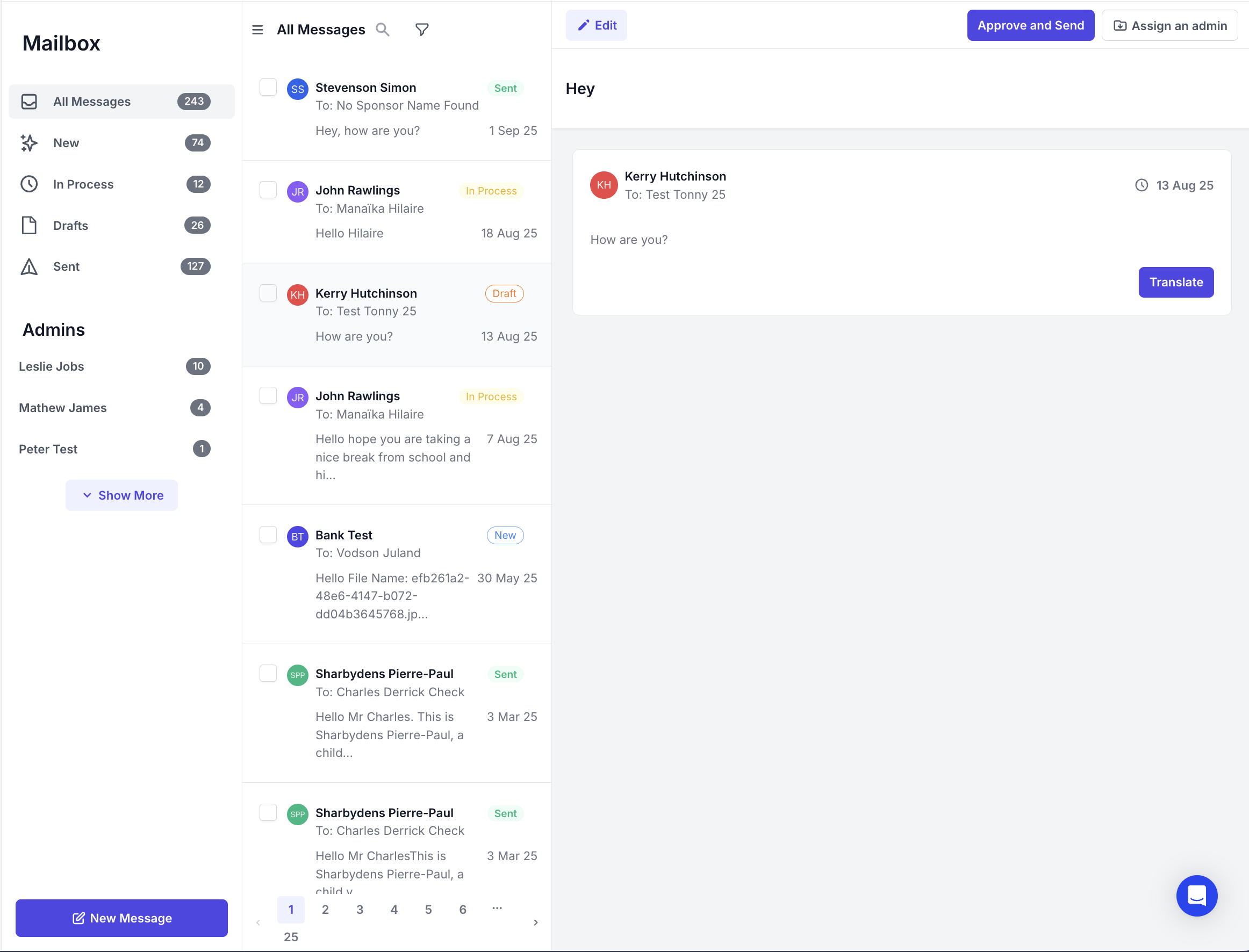 The Message Manager is a comprehensive communication hub that allows administrators to manage all correspondence between recipients and donors. This interface provides tools for creating, tracking, and organizing messages while maintaining clear communication channels.