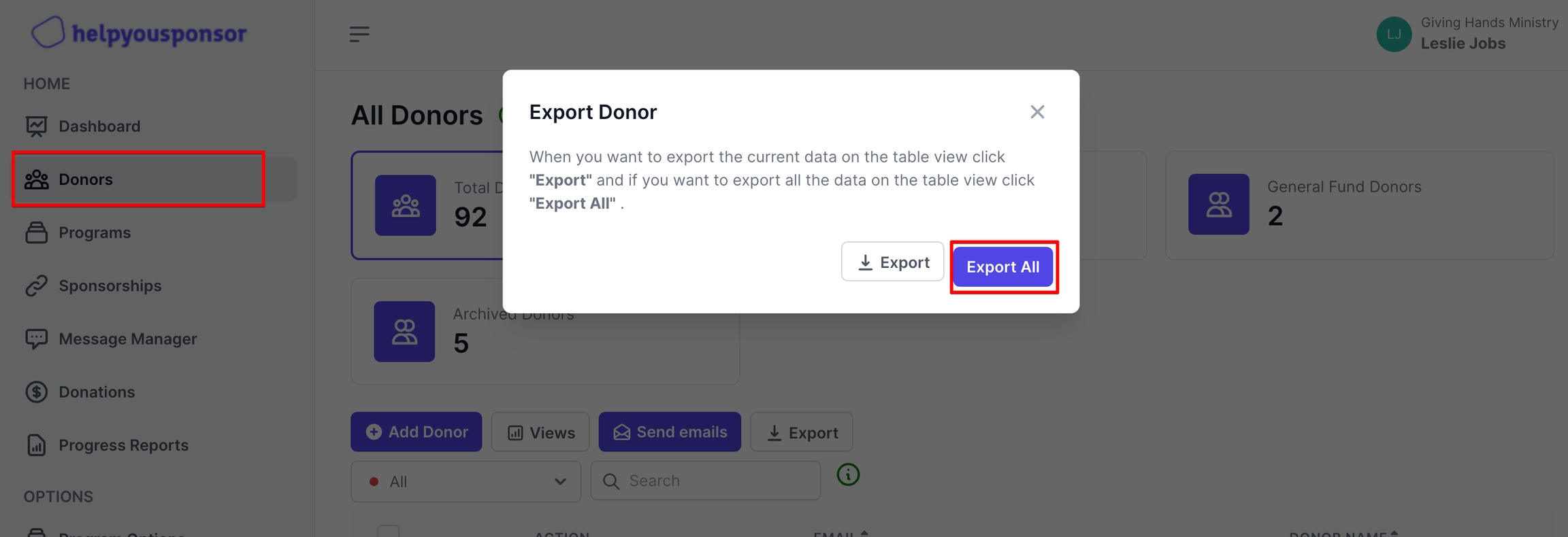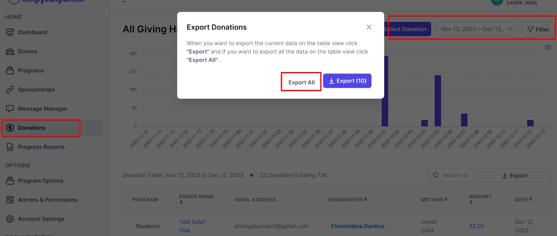 Select Donations on the side menu, Choose date period of donations to export, Click Export then Export All.