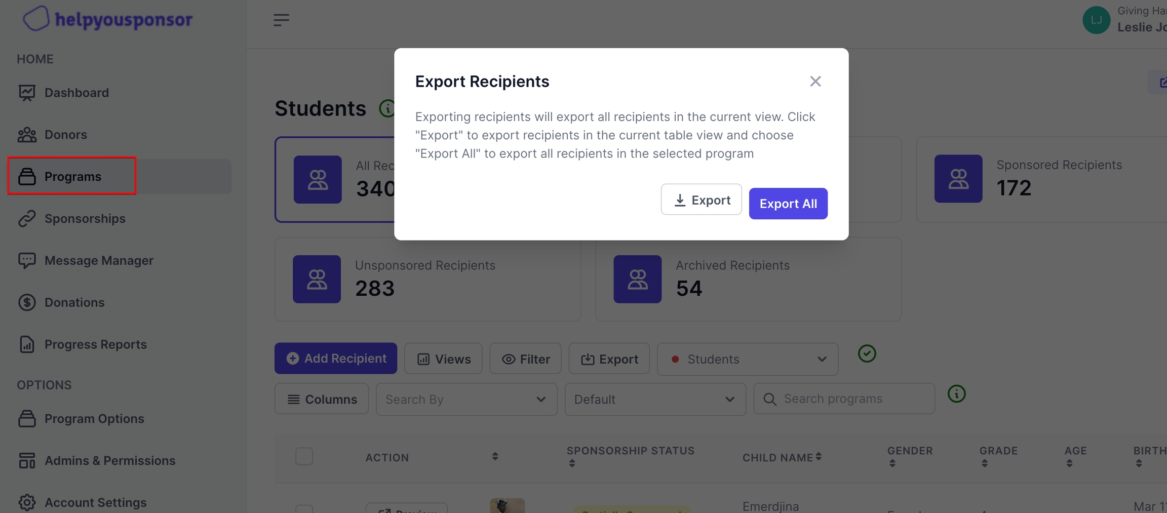 Select Programs in the side menu, choose a program to begin export, click Export and Export All.