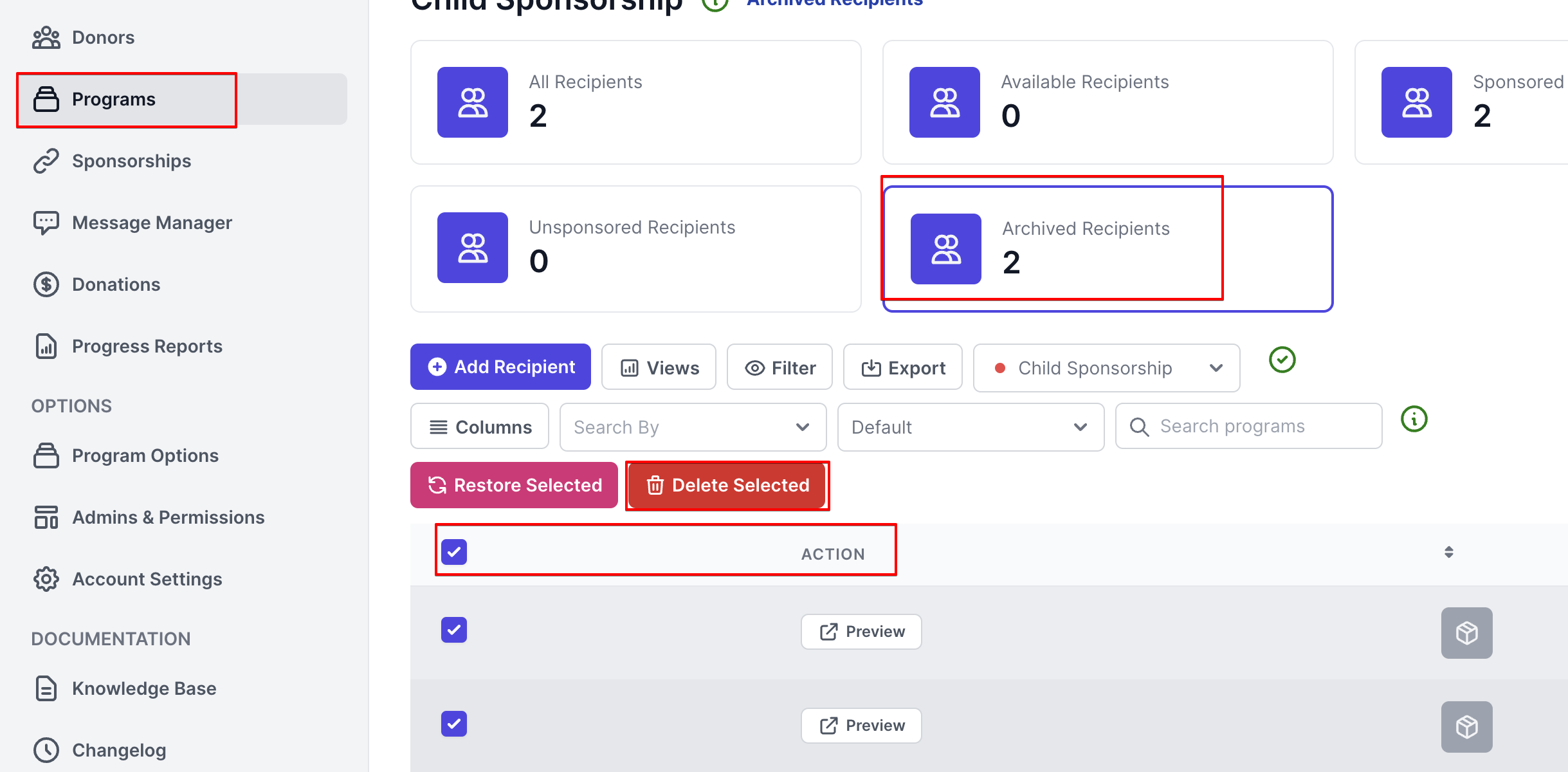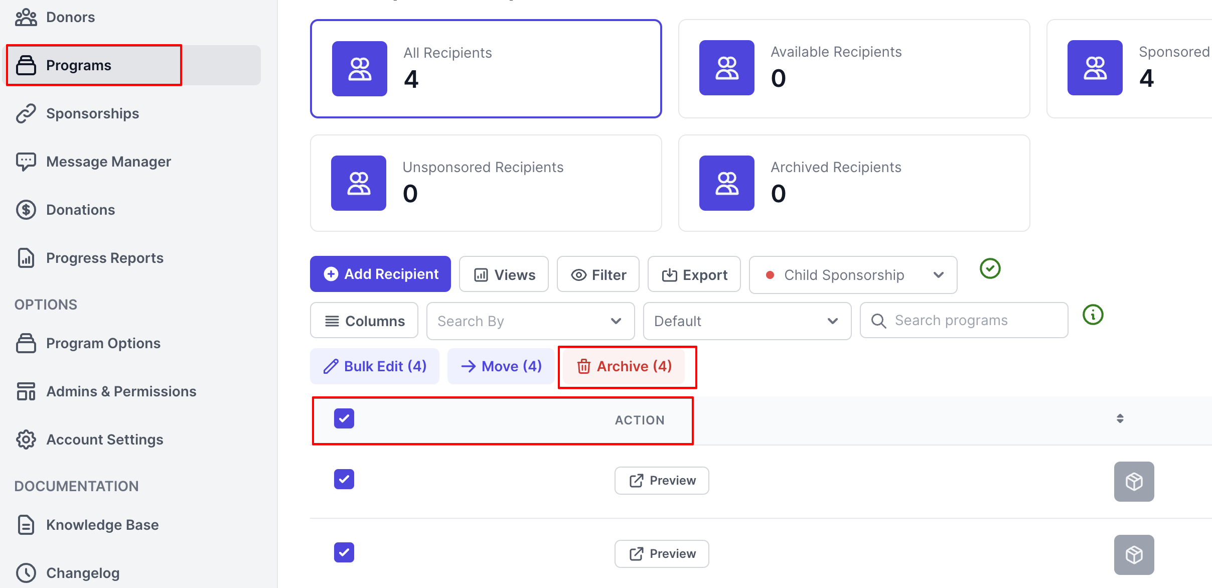 Select Programs in the side menu, choose the recipient's program, Click the tick box next to the Action header then Archive.