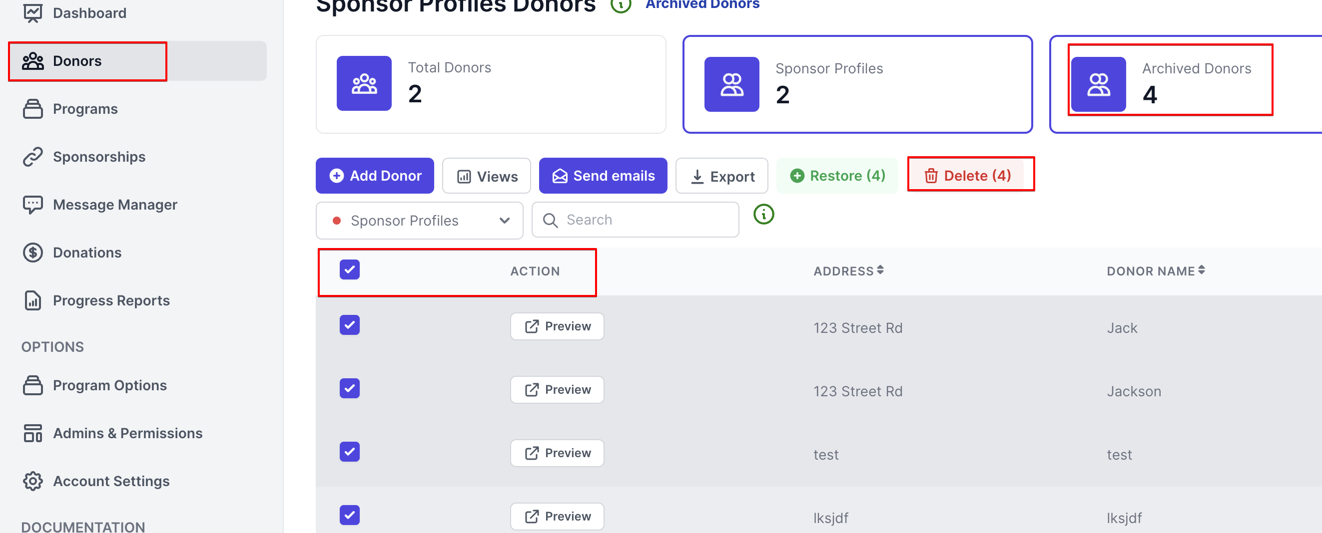 **Archive all donors, recipients and sponsorships, then proceed to delete all donors, recipients and sponsorships.**