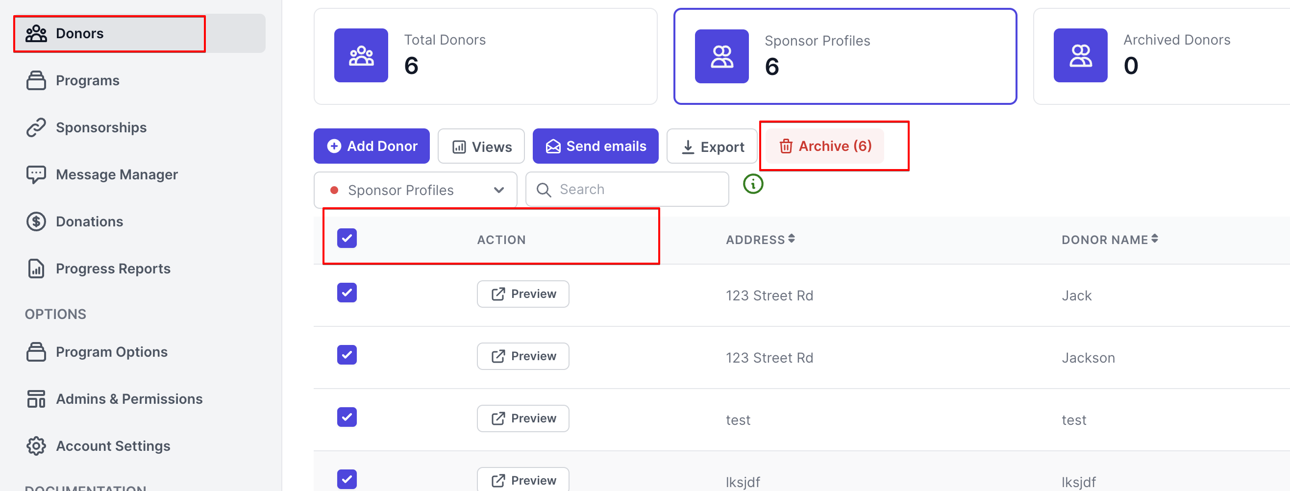 Select Donors in the side menu, Click the tick box next to the Action header then Archive.